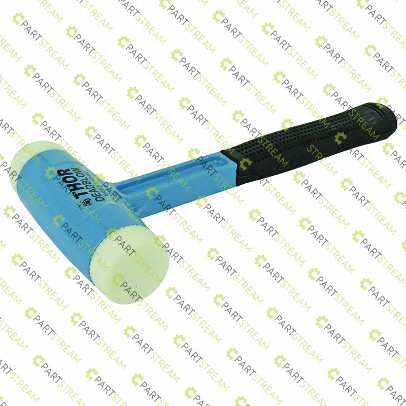 Thorace Nylon Soft Face Hammer. Faces are designed to wear and to be replaced by hand. All faces are one piece moulded. No metal pegs or inserts to damage the workpiece when worn. Serrations in the metal head prevent faces coming loose during use. Faces have a shoulder for extra strength and to prevent fracture from misdirected blows. A cavity inside the head is partially filled with steel shot which adds to the weight, prevents rebound and delivers dead blows of maximum force. Uses our Part No. 95-83242 Replacement Faces. Weight: 1150g. Face Diameter 50mm.