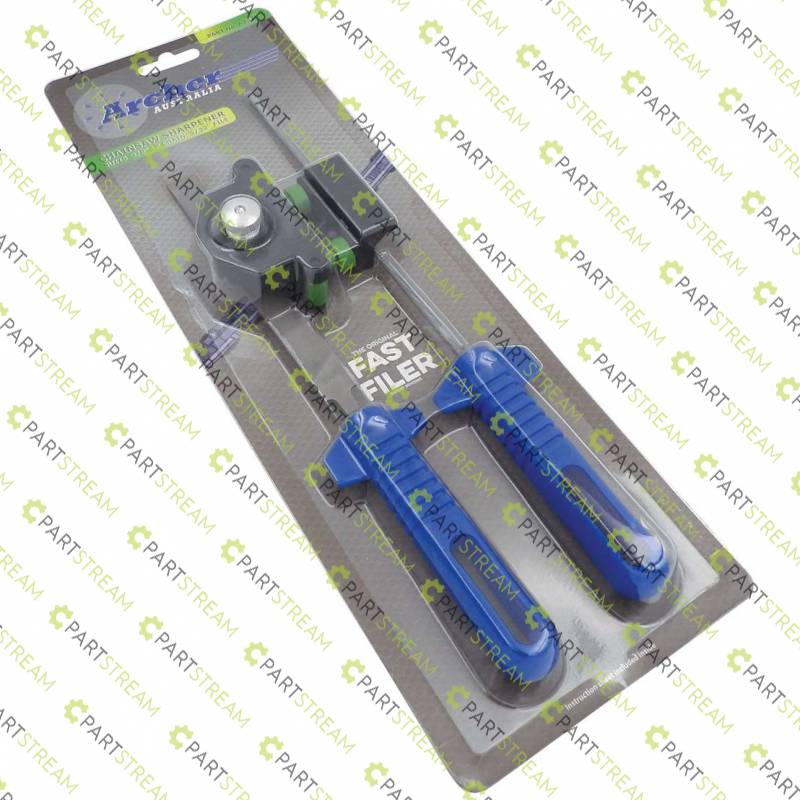 For 3/8" Lo Pro chain. The Fast Filer is the Simplest and most accurate saw chain sharpener. The Fast Filer sharpens all teeth exactly the same shape and length. Takes the guess work out and makes sharpening chain on the saw a breeze. Ideal for the amateur and the professional chainsaw user. Files depth gauges correctly. Complete with 2 x Vallorbe files & file handles. Packed in Retail Blister Pack.