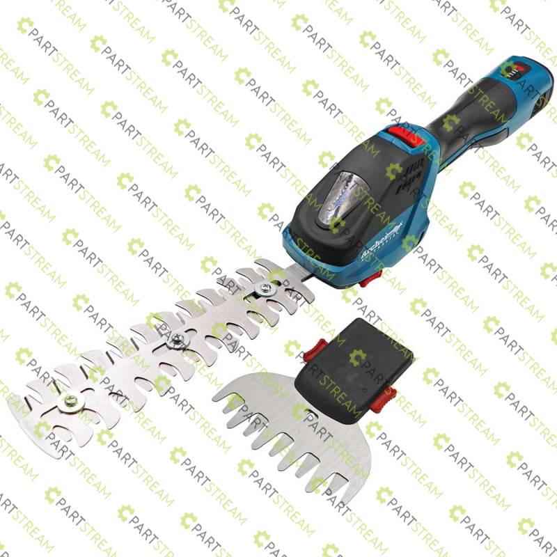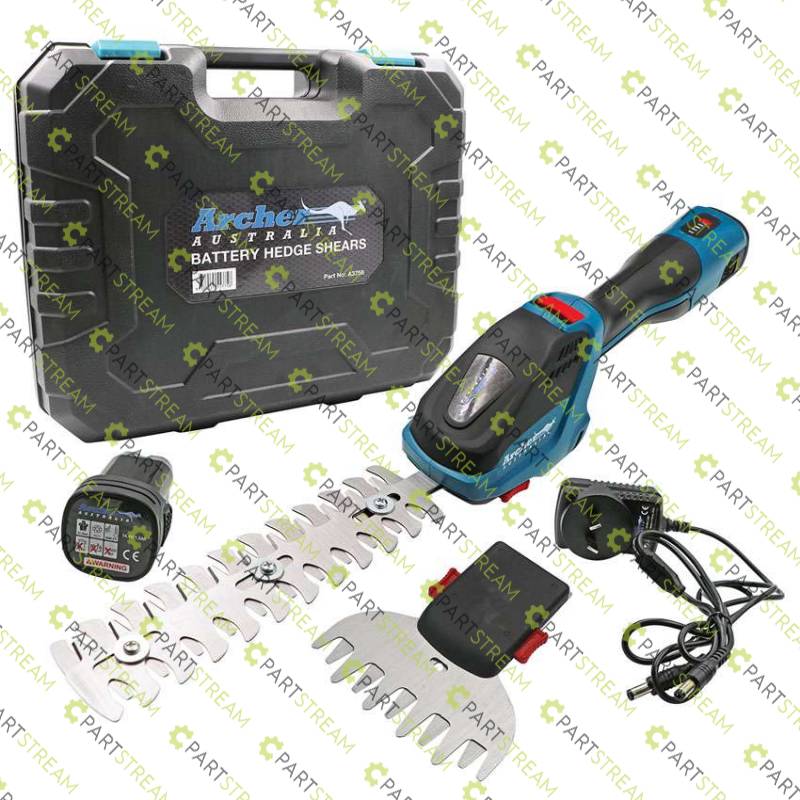 Mini Hedge/Grass Shears. Compact and light. Easy to use for trimming trees and shrubs, grasses, vegetation. 120mm SKS5 Grass Trimmer Blade. 200mm SKS5 Hedge Trimmer Blade. Battery Charge Level Indicator. Battery life - Up to 90 minutes under full load. Battery charge time - 90 minutes. CE Approved. Comes complete with 1 x 120mm Grass Blade, 1 x 200mm Hedge Trimmer Blade. 1 x 14.4V 1.5Ah Batteries, 1 x Battery Charger, 1 x HD Storage case. Weight: 1.1kg with battery.
